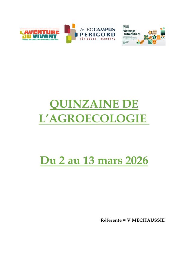 Pendant quinze jours, les élèves de l’Agrocampus Périgueux seront au cœur de la “Quinzaine de l’agroécologie”. Chaque jour, ils participeront à des activités différentes. Retrouvez le catalogue de l’ensemble des activités => https://drive.google.com/file/d/10vz2iNpPO8d1bbzH_Guay-e91Z6W9HJq/view?usp=sharing